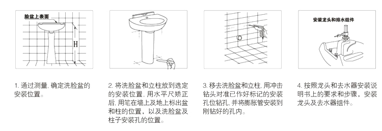 一、安装前的准备 1.安装前准备好安装工具。 2.水源要关闭,且预留给排水管路3 3.如是更换旧洗脸盆,应在拆除旧洗脸盆前关闭水源。 4.清理好安装现场。二、安装步骤