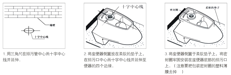 一、安装前准备: 1、安装前准备好安装工具; 2、检査各管路是否畅通,以及安装面是否平整; 3、对照坑管中心到墙面距离与所购便器坑距是否相符。 二、安装步骤(注:安装前请认真阅读此说明,如是不正确安装造成的损失,公司概不负责。